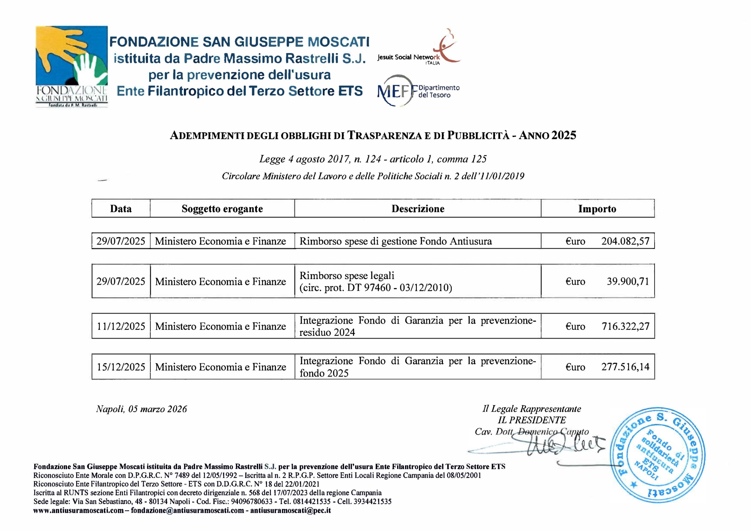 È stato firmato il 14 novembre 2023, a Napoli il rinnovo per altri 3 anni della convenzione, che prosegue dal 2020, tra Banca Mediolanum, Fondazione Mediolanum EF e la Fondazione San Giuseppe Moscati istituita da padre Massimo Rastrelli per la prevenzione dell’usura. Si tratta di una convenzione atta a facilitare l’erogazione di finanziamenti a favore di persone con difficoltà di accesso al credito e in condizioni di indigenza residenti in tutta la regione Campania.